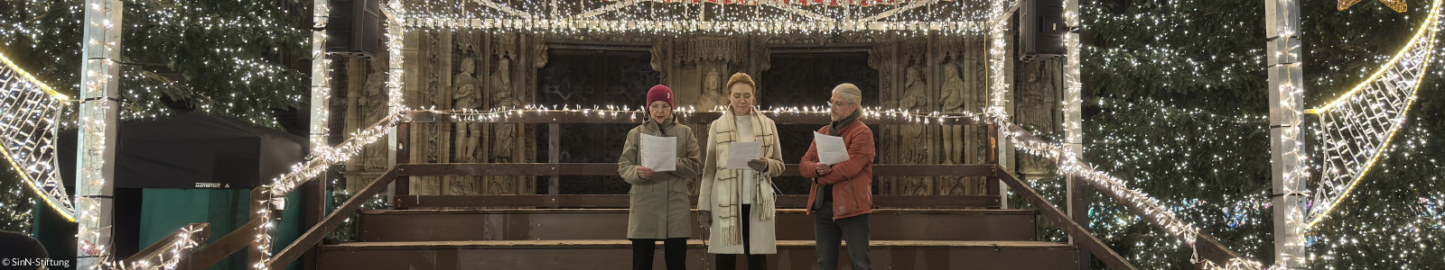 Am ersten Dezember 2025 lasen Pfr. Thomas Amberg von Brücke-Köprü, Svitlana Karpeniuk und Sabine Arnold von der SinN-Stiftung die Weihnachtsbotschaft auf dem Christkindlsmarkt.